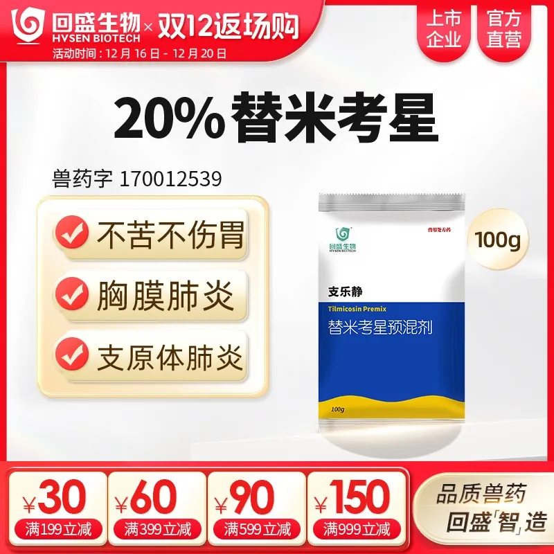 處方藥 【回盛生物】20%替米考星預(yù)混劑100g 家畜呼吸道疾病咳嗽喘氣藍(lán)耳傳胸副豬豬肺疫喘氣病支原體肺炎