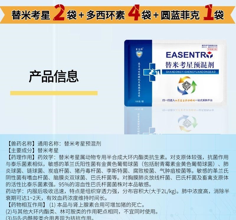 - 滿贈滿5件贈1件,藍耳凈化套裝 規格:替米考星2袋+多西環素4袋+圓藍菲克1袋