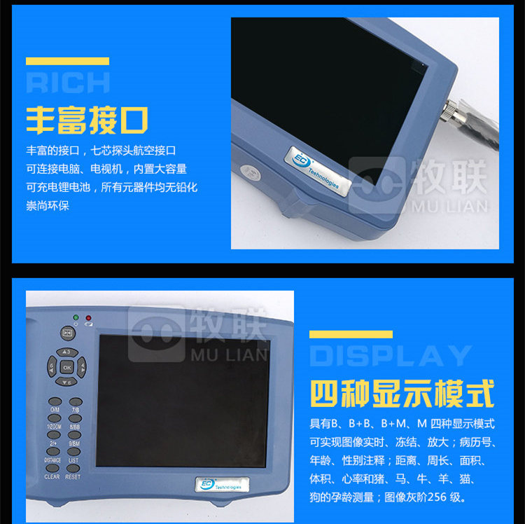 儀器應用微機控制和數字變換器,整機圖像清晰、穩定、分辨力高;具有B、B+B、B+M、M 四種顯示模式;,特設節電模式,使電池供電更持久