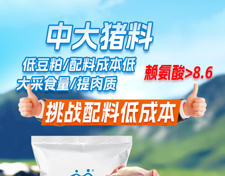 這款核心料,豬從90斤到500斤都能用,高氨基酸配方,賴氨酸含量8.6%,比4%預混料含量高出1倍多,讓豬長得更快,配料成本更低。