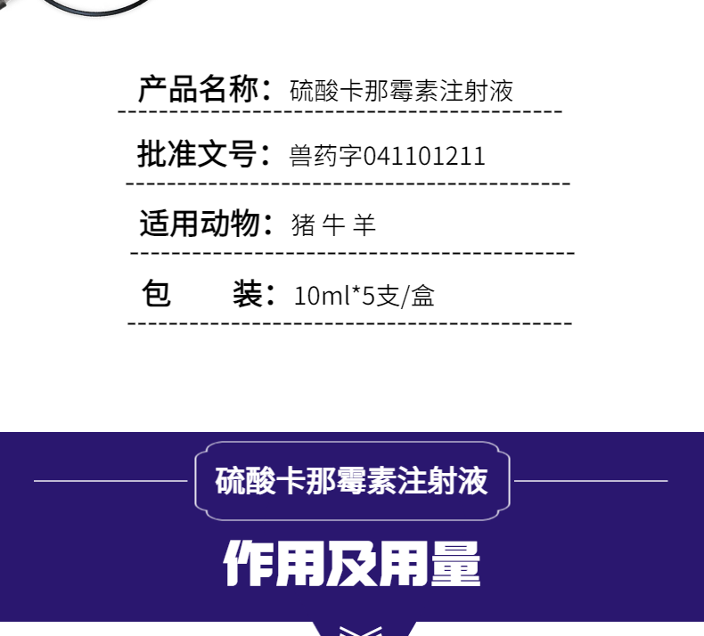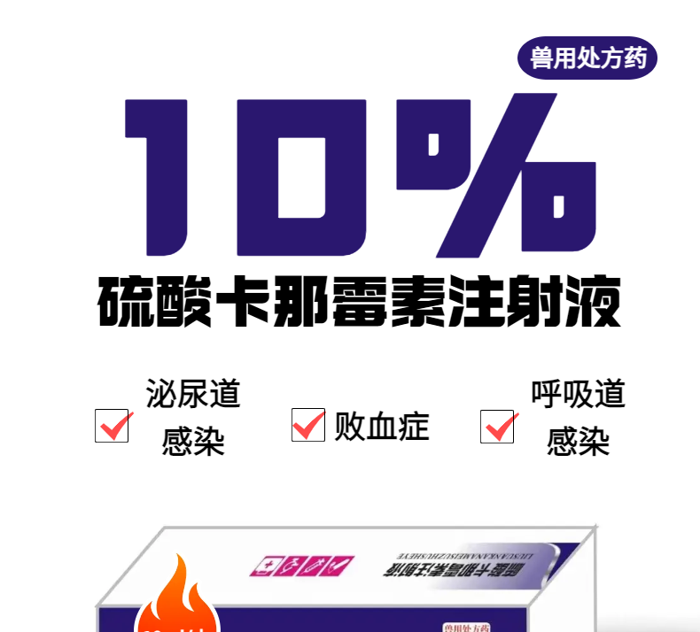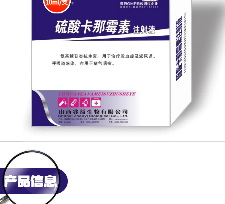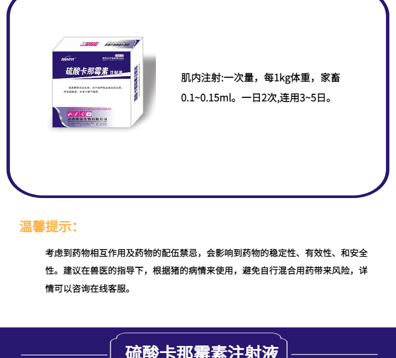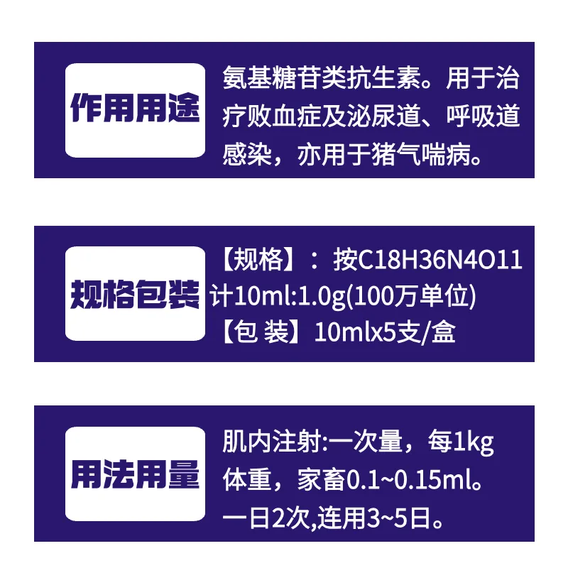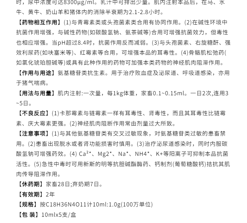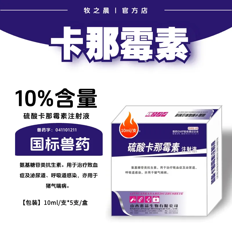 處方藥 【牧之晨】10%硫酸卡那霉素注射液 10ml*5支/盒 用于治療敗血癥及泌尿道、呼吸道感染,豬氣喘病