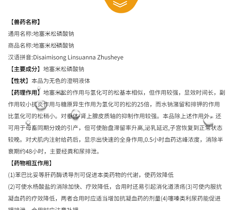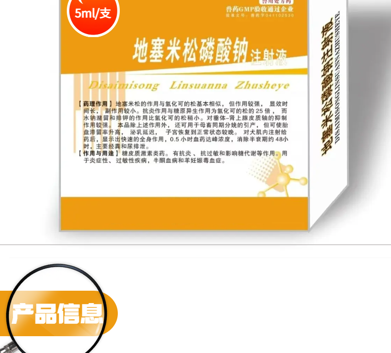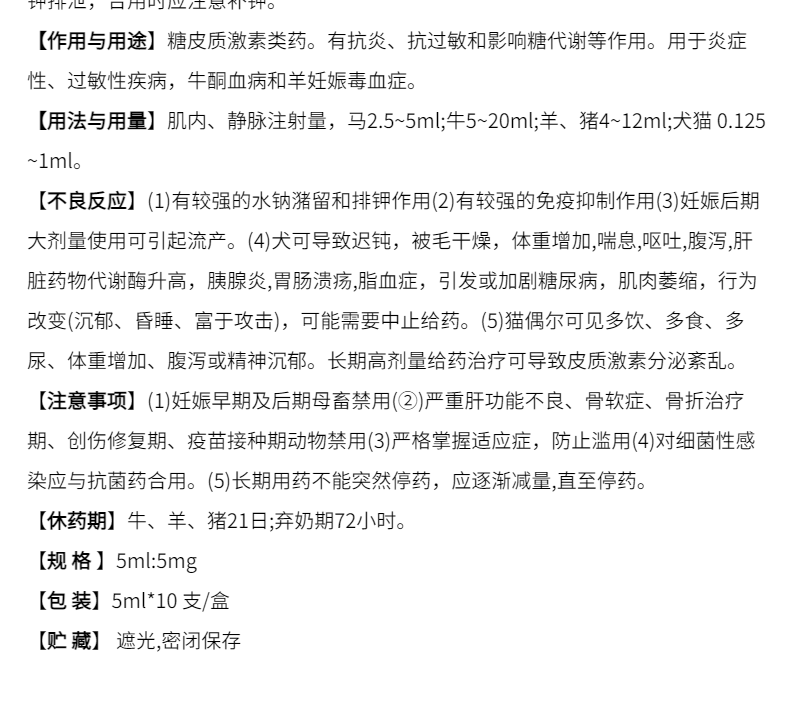 本品有抗炎、抗過敏和影響糖代謝等作用,用于炎癥性、過敏性疾病,牛酮血癥和羊妊娠毒血癥等。