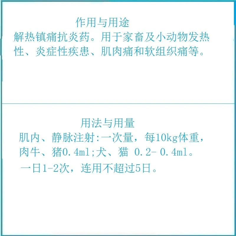 用于發熱性,炎癥性疾患,肌肉痛,軟組織痛,配合抗生素用于母豬無乳綜合征輔助治療,10ml*10支/盒*40盒/件