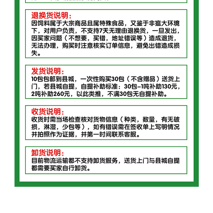 售后咨詢,物流查詢,不支持無理由退貨 承運方:天津匯佳物流,查貨請說收貨地址姓名飼料品牌,承運方電話:022-29289986 比爾帕特(天津)飼料有限公司負責人電話:13363769302 到貨時間為5-10天,當地貨站電話通知提貨