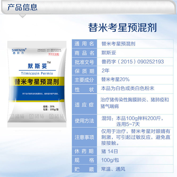 處方藥 【西默農(nóng)】 100g默斯妥 20%替米考星 替米主治豬喘氣病、胸膜肺炎、副嗜血桿菌病、萎縮性鼻和藍(lán)耳