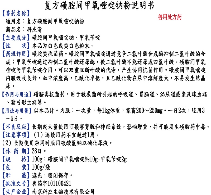 處方藥 【整箱購】復方磺胺間甲氧嘧啶鈉10%+2%(100g×50袋),呼吸道胃腸道感染弓形蟲病。